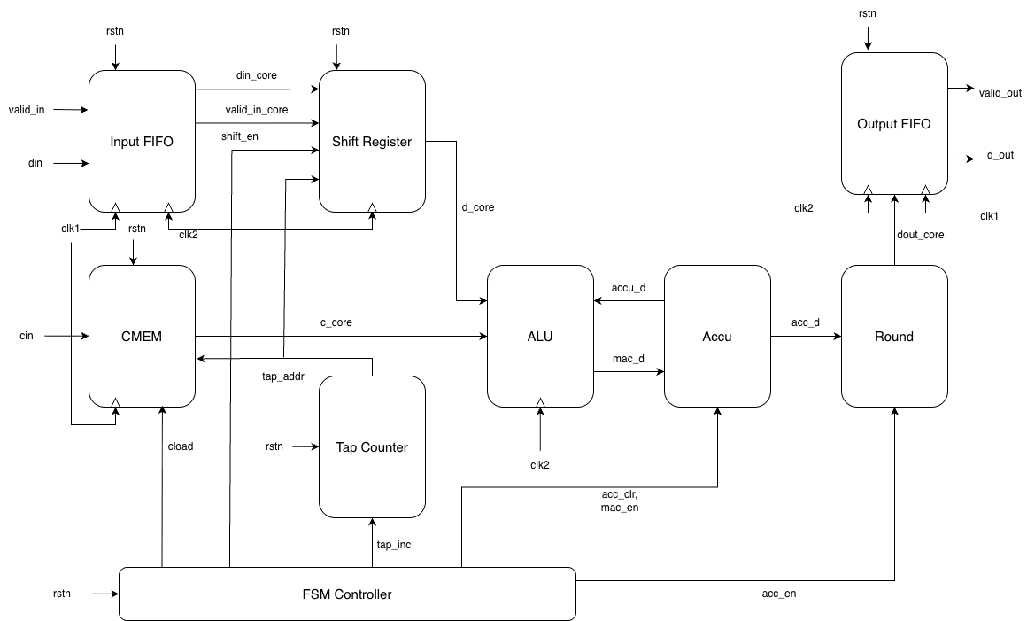 This project presents the design, implementation, verification, and synthesis of a 64-tap 16-bit finite impulse response (FIR) filter using a dual-clock architecture. The system achieves real-time 10 kS/s throughput with a 10 kHz input clock and a 1 MHz core clock, incorporating fixed-point arithmetic, robust clock domain crossing, and a sequential multiply-accumulate datapath optimized for area and power efficiency. [report]